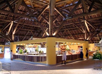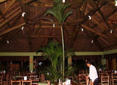 “Optamos por estrutura de madeira e cobertura de piaçava, mas buscamos criar um perfil moderno, sem a banalidade típica da combinação entre esses elementos”, explica. O sistema construtivo de madeira foi empregado em toda a área social, exceto nas unidades de hospedagem. Ele utiliza toras maciças de eucalipto com diferentes diâmetros, solidarizadas por meio de encaixes, parafusos, chapas e peças de conexão.